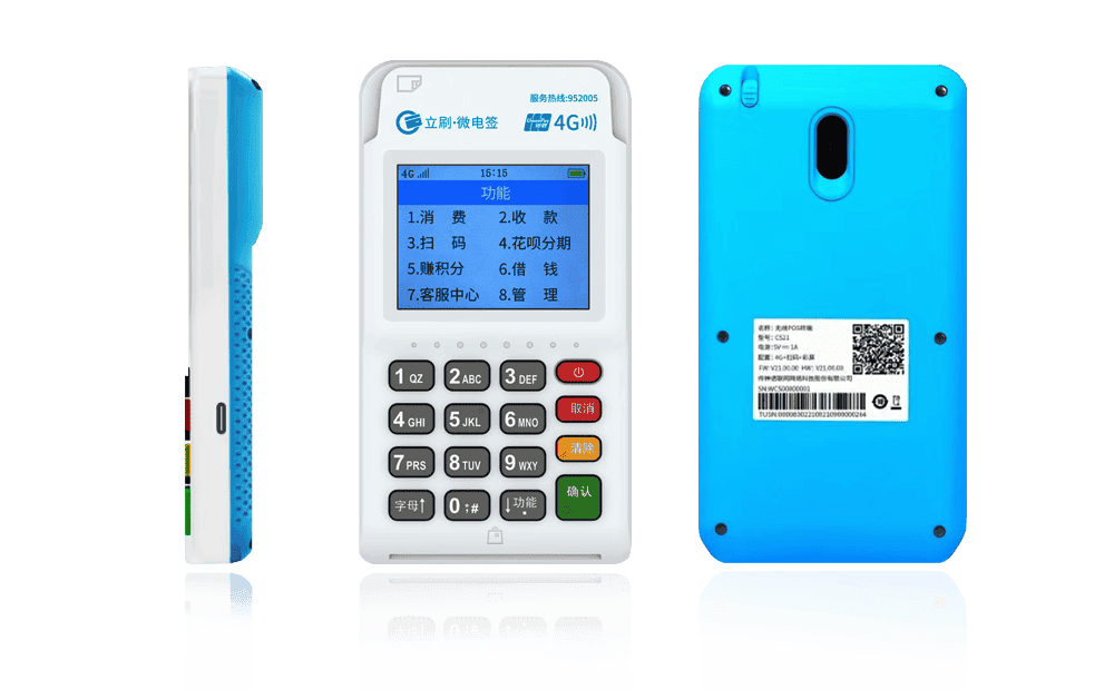 1. 产品形态:机身小巧轻便,配备触摸屏、摄像头(用于扫码)、内置流量卡、支持Wi-Fi连接,并内置热敏打印机,可现场打印签购单。